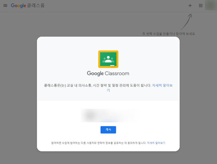 구글 웹사이트에서 오른쪽 상단 '+'를 누른 후 '수업 참여하기'를 통해 접속한 후 해당 코드를 붙여 넣고 '참여하기'를 누르면 됩니다.
