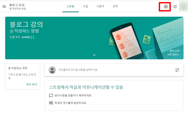 클래스룸 첫 화면을 확인하실 수 있으며 '스트림' 텝의 오른쪽 '테마 선택'을 눌러 배경 사진을 변경할 수 있습니다. '사진 업로드'를 누르면 원하는 사진을 첨부하여 변경도 가능합니다.
