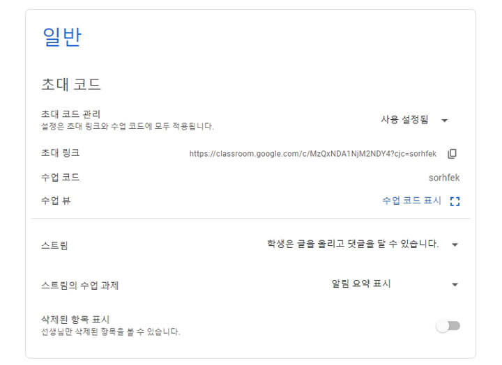 클래스룸 화면 우측 상단 '톱니바퀴'를 눌러 '일반' 텝에서는 '수업 코드'를 확인하실 수 있는데 초대 링크의 오른쪽 복사 버튼을 누르면 복사할 수 있습니다. 학생은 이 초대 링크나 수업 코드를 통해 클래스룸에 접속할 수 있습니다.